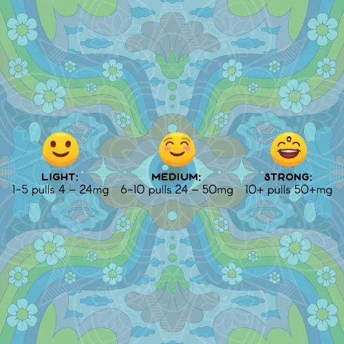 Each 3-second inhalation from the cartridge delivers roughly 4mg of 5-MeO-DMT. Dosage intensity may vary based on personal sensitivity and usage technique. Use the chart below as a general reference: